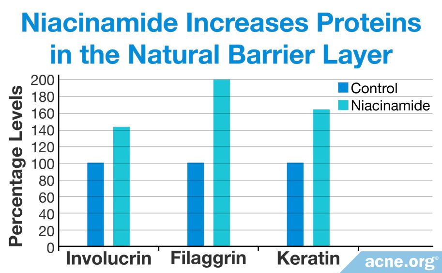 - Improves the skin’s natural barrier function. Another benefit of niacinamide is that it increases moisture retention by improving the skin’s barrier function. By increasing the production of ceramides (a type of fat that prevents the skin from drying) and keratin (a protein that gives the skin its strength, flexibility, and waterproof qualities), niacinamide boosts the strength of the skin’s barrier, which helps prevent water-loss and heal acne lesions.