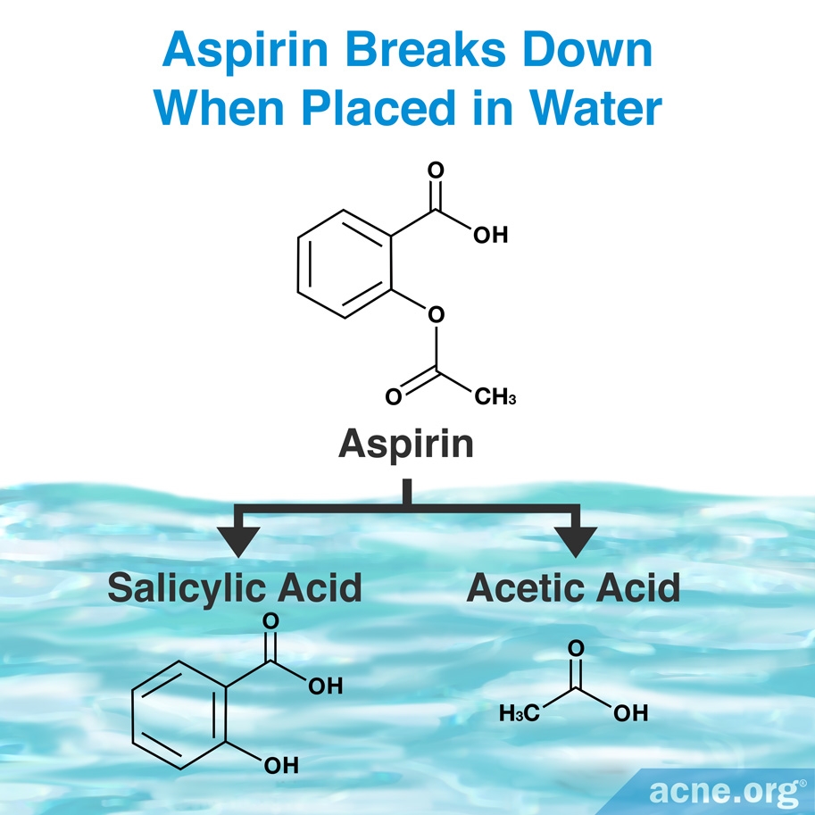 When dissolved in water, aspirin breaks down into salicylic acid, which you may have seen listed as an active ingredient on over-the-counter acne products before. Salicylic acid has skin-shedding and anti-inflammatory properties, and can help reduce acne symptoms.