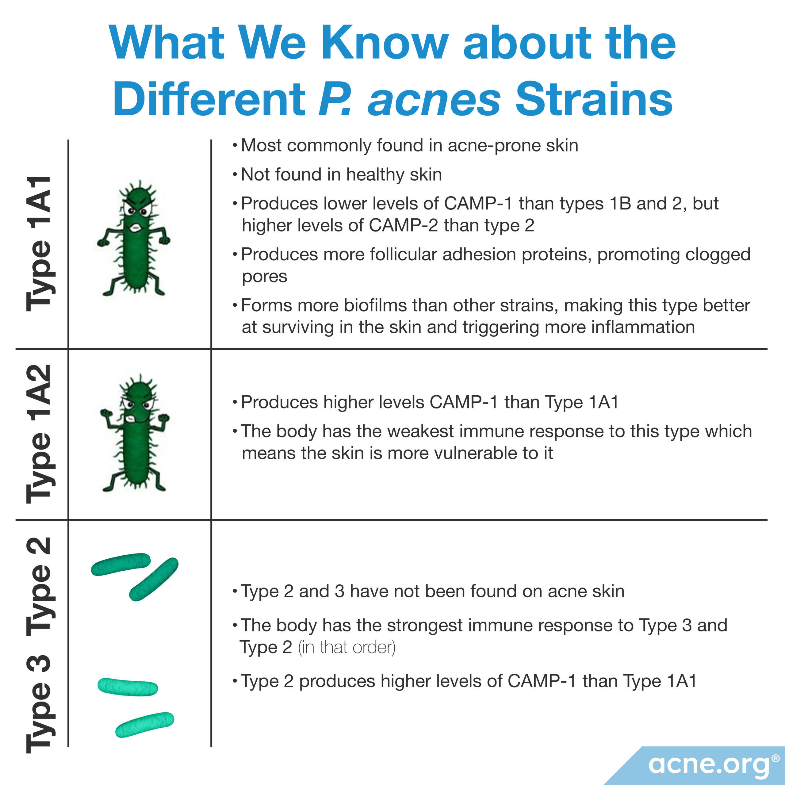 Results of these studies show that type IA1 may be better able to survive inside clogged pores, which explains why we see them more often in acne-prone skin. Also, type IA1 may provoke the immune system in different ways than the other strains, but researchers need to perform more research to understand exactly how this might affect acne development.
