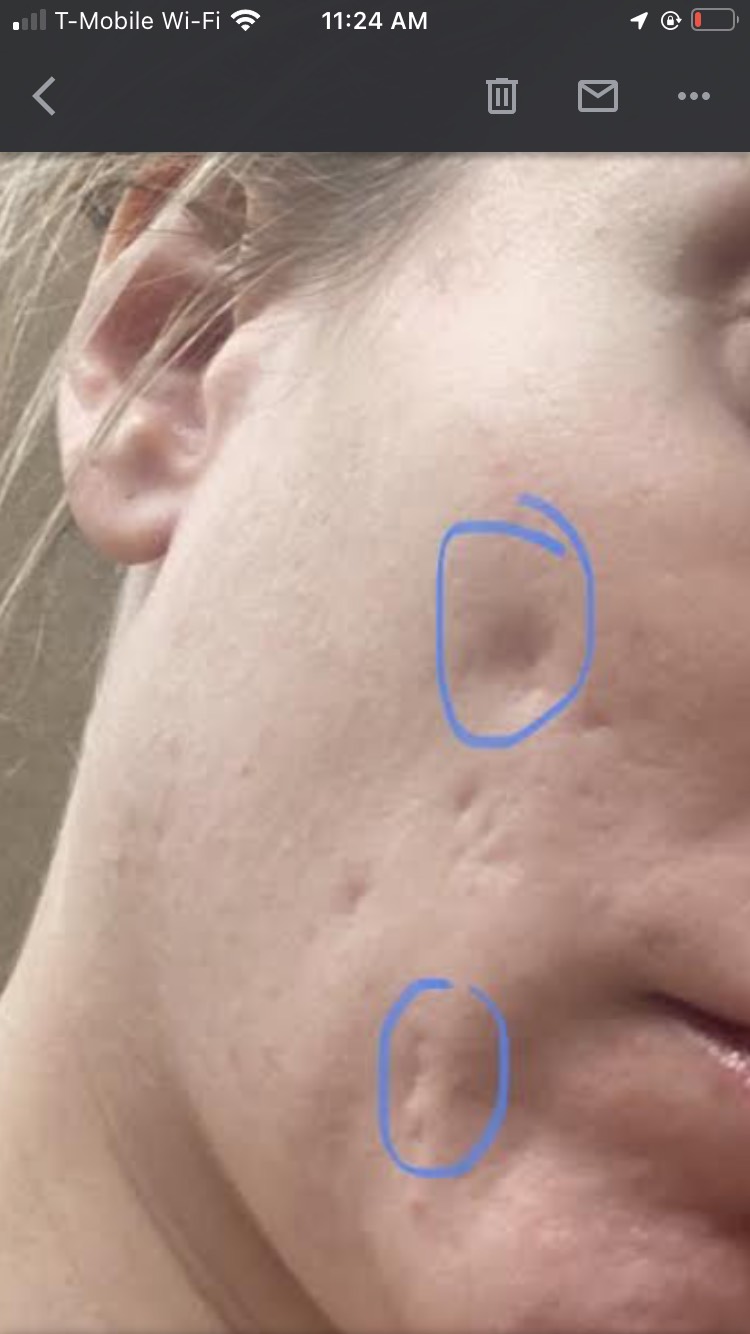 Here is a pic in different lighting - if the larger excision goes well, I MAY want the one down by my chin excised that I circled too. However, I may try microneedling first to see if that helps with the smaller ones. I have already done subcision/filler/ultraclear laser twice with 30% improvement on small ones and maybe up to 20% on large one.