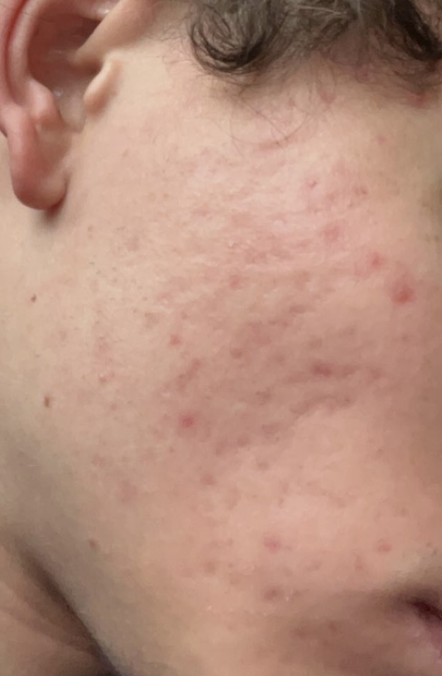 It looks like you're still breaking out a bit to me. Most important is to get that under control so you're not creating new scarring.