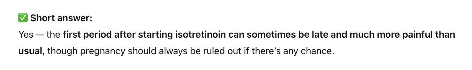 Today Ive been on isotretinoin in 20mg dosage for over 20 days. I just got my period after it being late for 10 days, which I read happens a lot. But my period was way more painful than usual and pain killers didnt stop it, from the research i read about women on isotretinoin I dont see a similar correlation, but I cant imagine another situation.