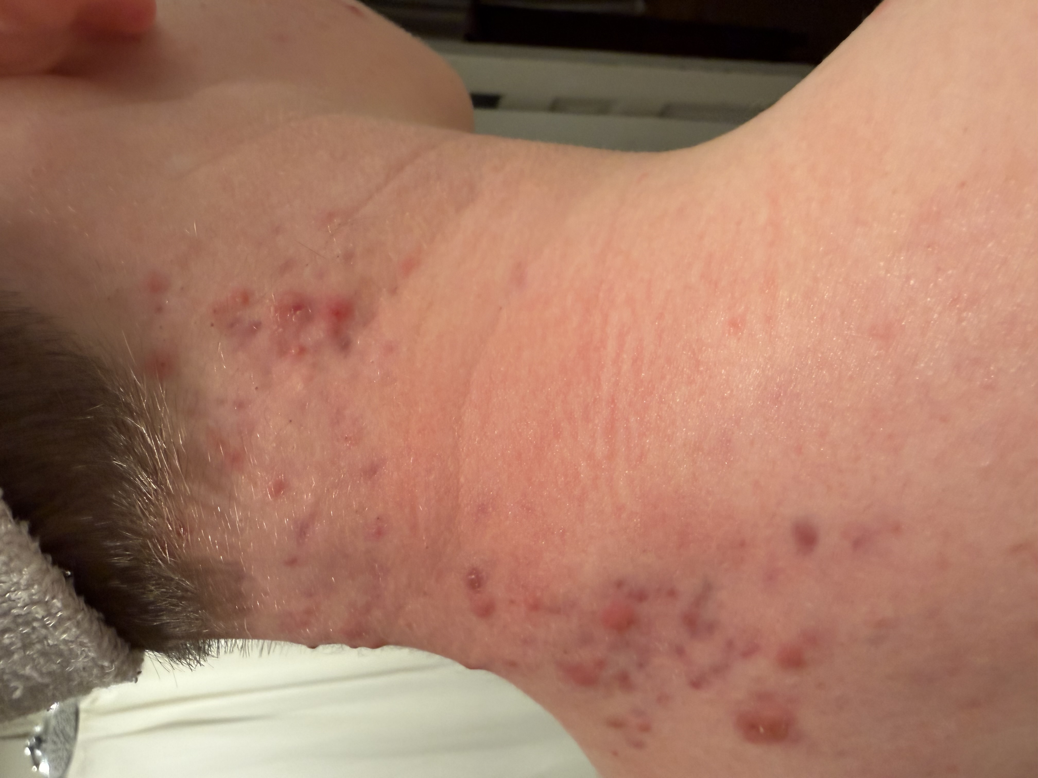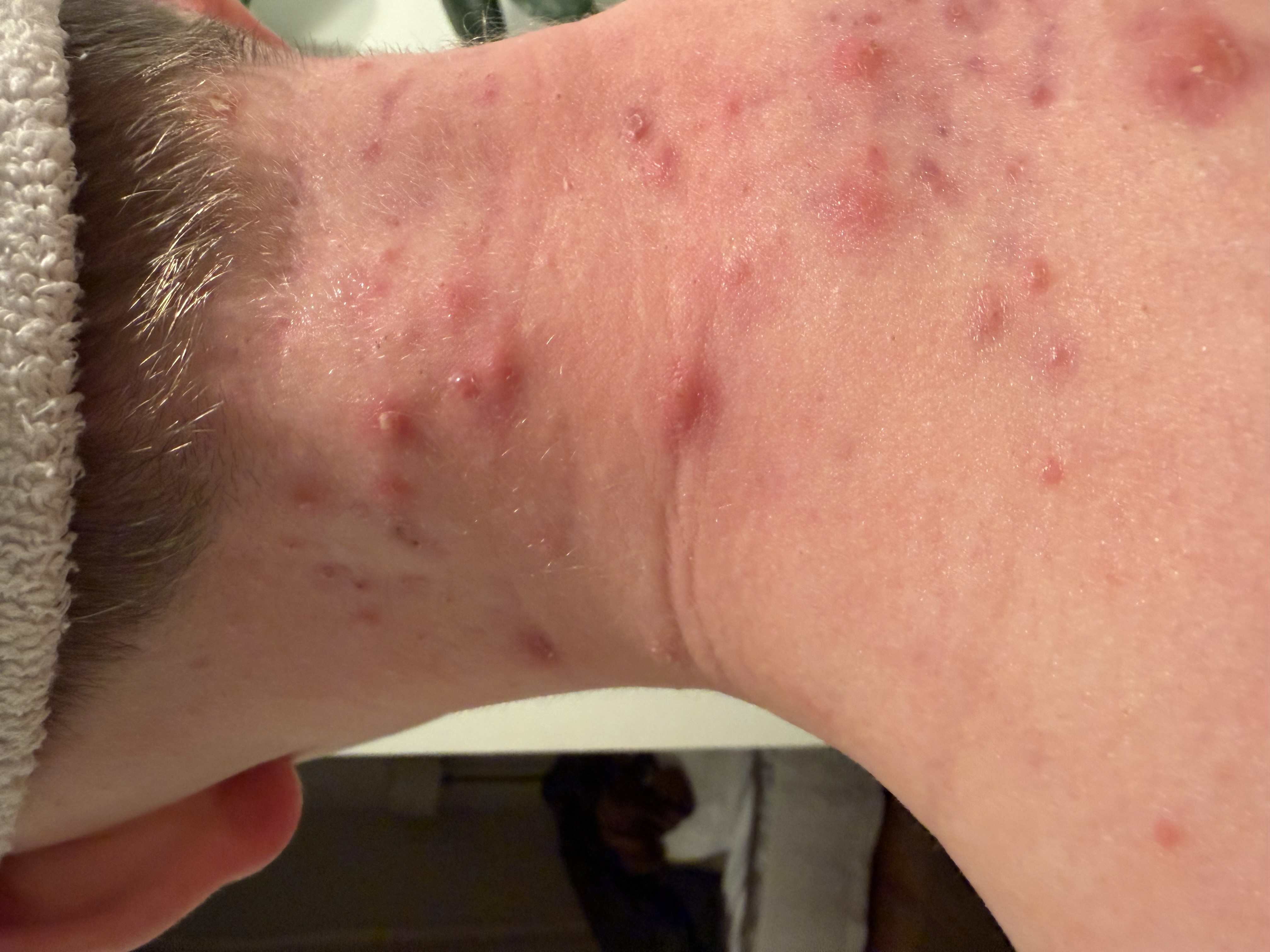 This is my sons back, neck, and chest area. It has flared up annd down over the past 6 months, but never quite healed. We have been using typical acne treatment (benzoyl peroxide wash, Adapelene gel, gentle cleanser, and SA).