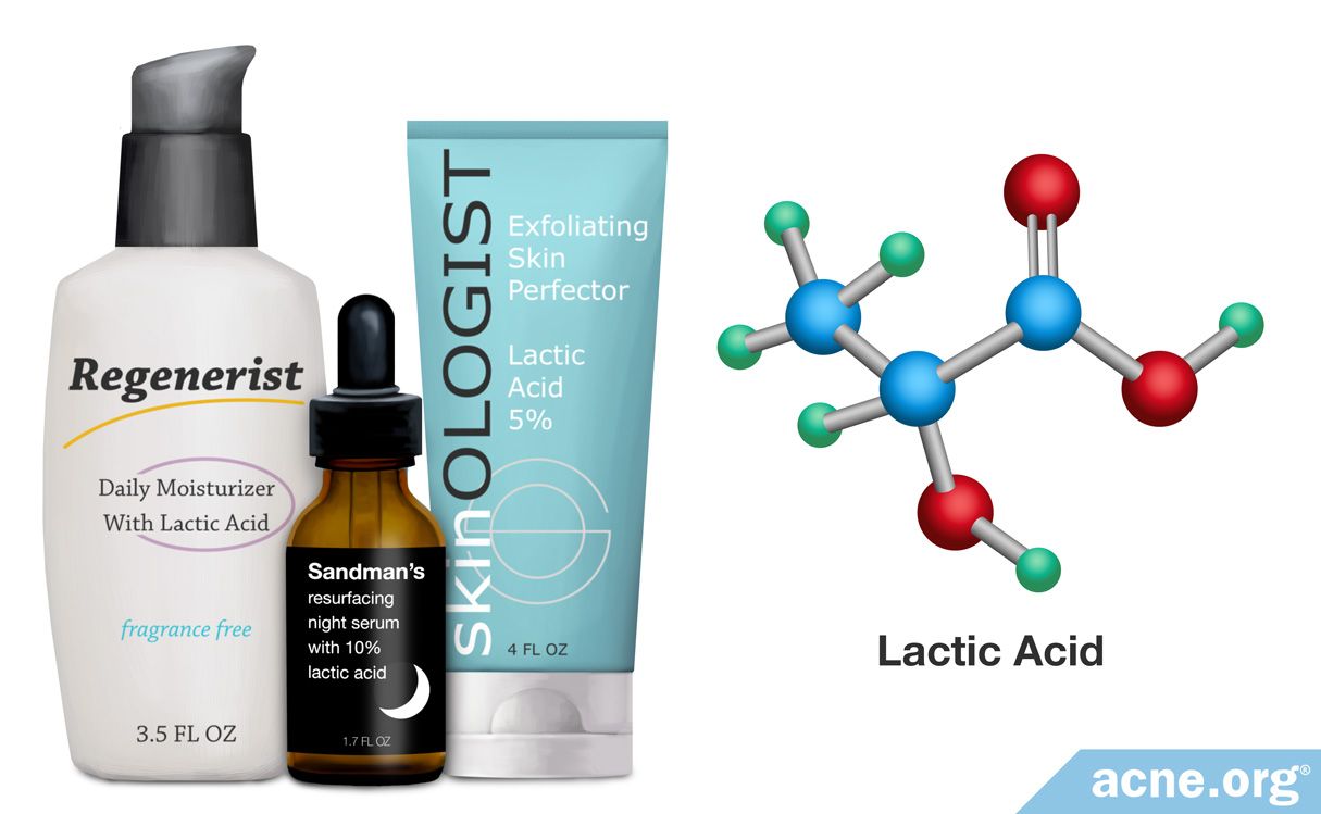 Lactic acid is an alpha hydroxy acid (AHA) that is mainly used for its anti-aging properties, but since it is an AHA, it should be somewhat effective against acne as well, particularly when used alongside other acne medications.