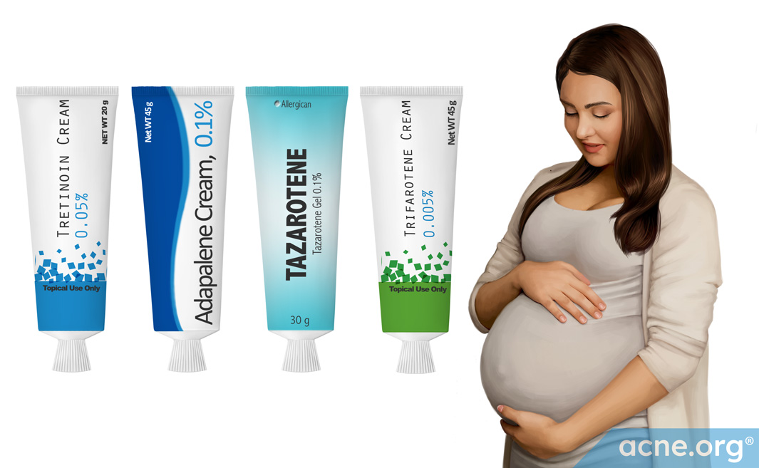 Doctors commonly prescribe topical retinoids (tretinoin, adapalene, tazarotene, trifarotene) to reduce acne. So far, there are not enough studies on topical retinoids to conclude that these products are safe to use during pregnancy. Women who are pregnant or planning to become pregnant should consult a physician before using a topical retinoid.