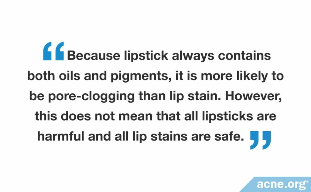Because lipstick always contains both oils and pigments, it is more likely to be pore-clogging than lip stain. However, this does not mean that all lipsticks are harmful and all lip stains are safe for acne-prone skin. It all depends on the specific ingredients in each particular product.