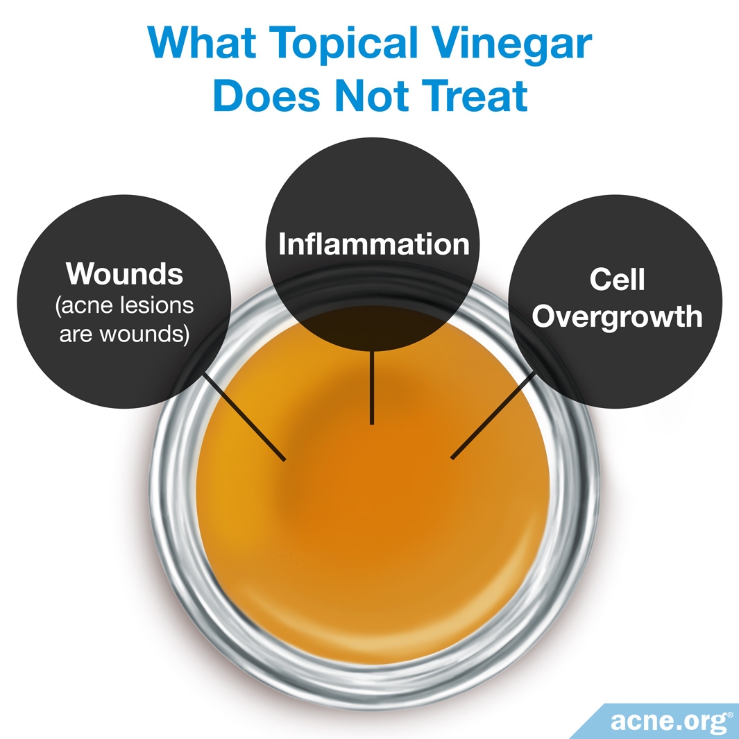 However, there is no evidence that vinegar helps with other aspects of acne such as inflammation, wound healing, or cell overgrowth, and there is some concern that a compound in vinegar, called acetic acid, might increase inflammation in the skin.