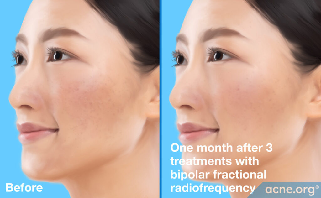 Bipolar fractional radiofrequency is a procedure that uses an array of electrodes that produce controlled microthermal (small bits of heat) injuries to the dermis with scattered areas of unaffected skin in a dot matrix pattern. This provokes a significant dermal wound healing response, resulting in the stimulation of cells that produce collagen and elastin, which contribute to the improvement of acne scars.1,2