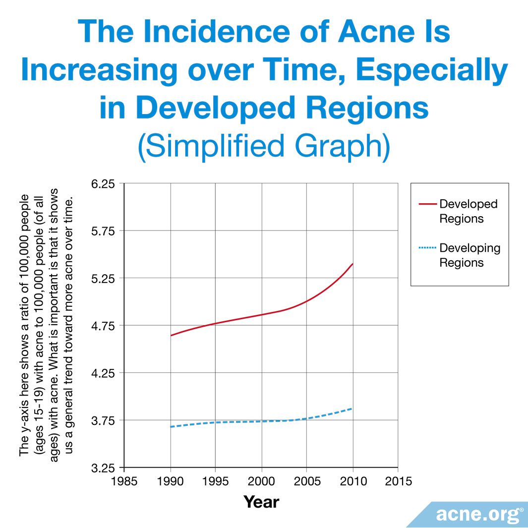 As the decades pass, the incidence of acne increases around the globe. However, isolated hunter-gatherer peoples in developing countries are a startling exception. Adolescents and adults in these communities suffer from acne at a far lower rate than in industrialized areas, and in some tribes, acne is unheard of. Adding complexity to this mystery is the fact that when these isolated people move into industrialized areas, acne starts rearing its head.