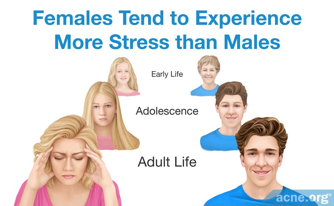Psychological stress is a negative state of mind that women as a whole tend to experience more than men. If stress continues for long periods of time, it can become chronic, leading to disorders like chronic anxiety and depression, and also potentially more acne.